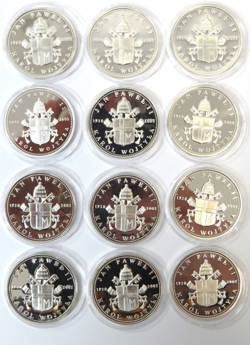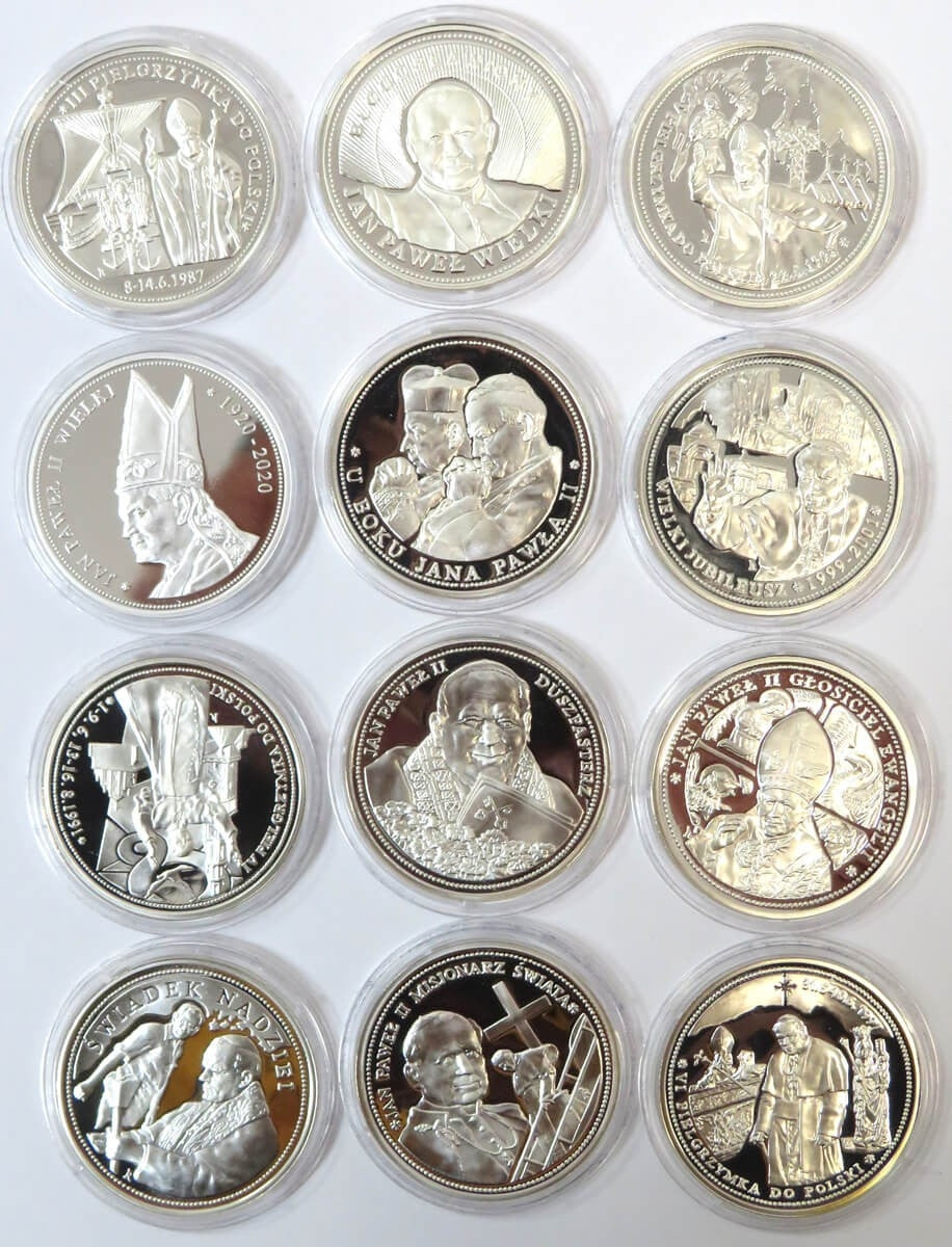 Zestaw 12 medali z Janem Pawłem 2, srebro + kaseta + certyfikaty