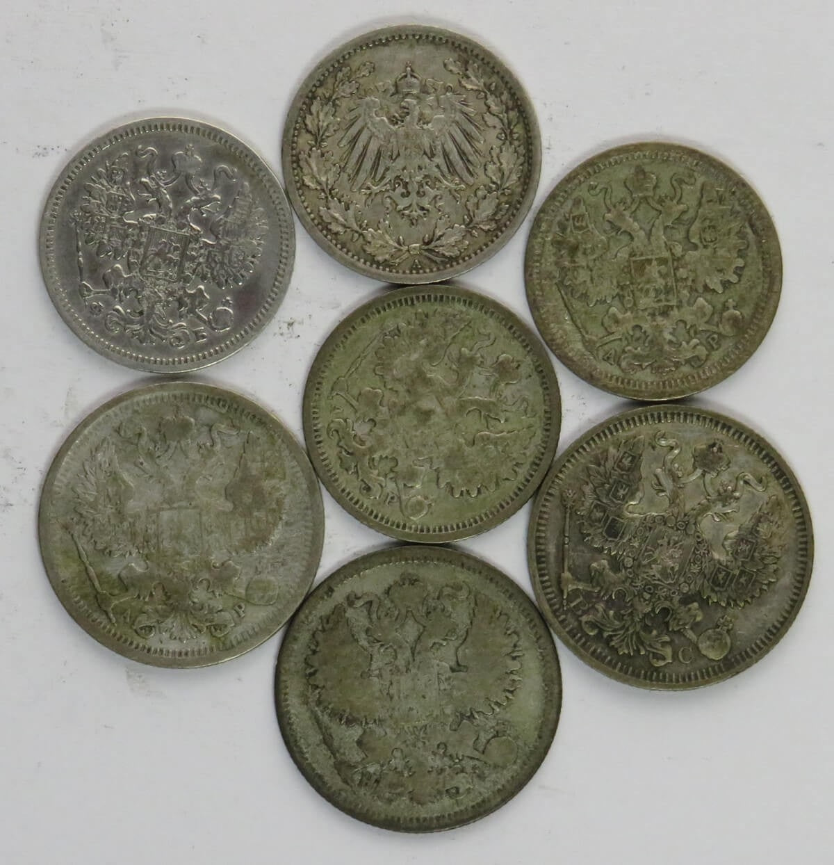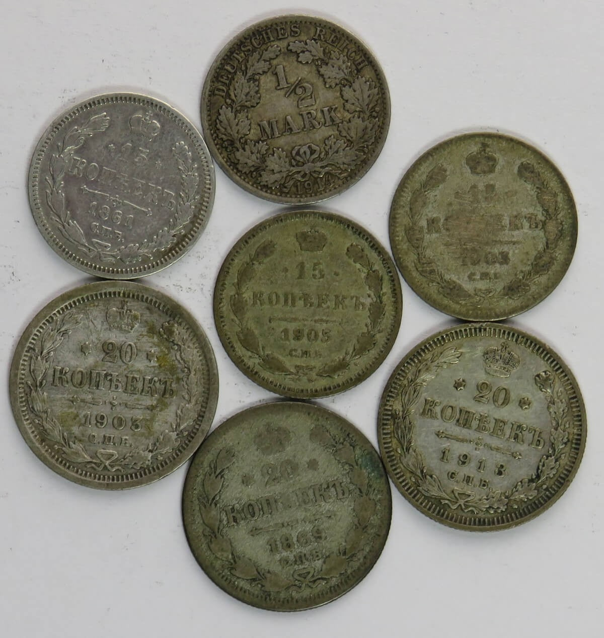 Zestaw srebrnych kopiejek carskich + 1/2 marki Ag